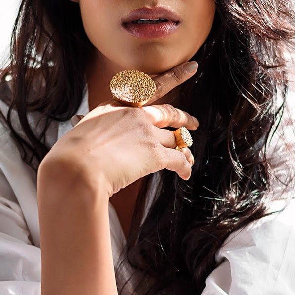 Our Kanika rings come from the idea of signet rings. They are designed to be unisex and come in multiple shapes to choose from. We’ve used floral textures on them to mimic wall carvings found in Indian temples. They’re chunky, no-fuss and classic. Comes in set of three - oval, round and oversized.