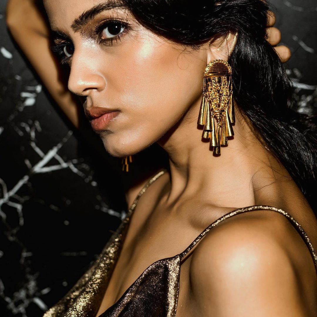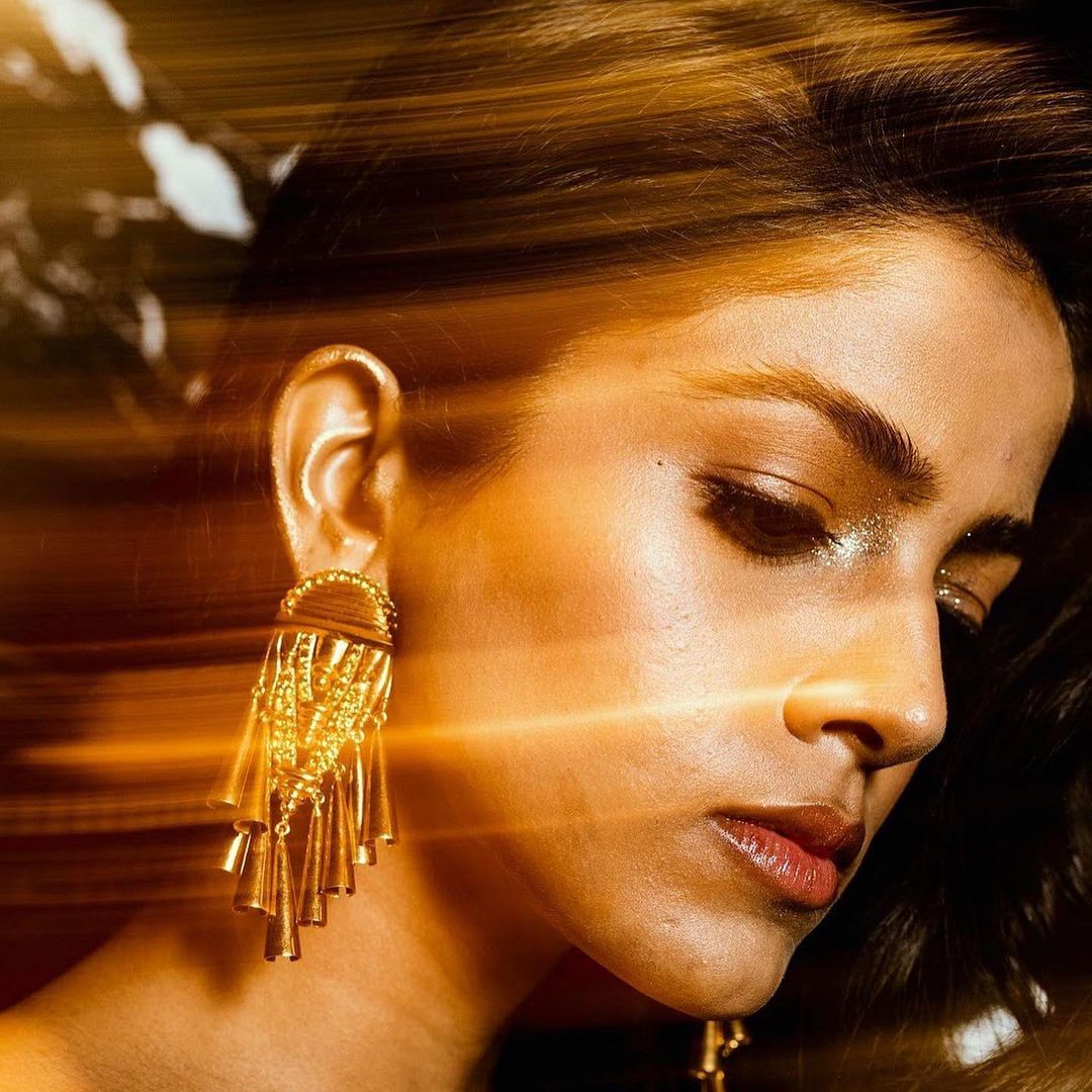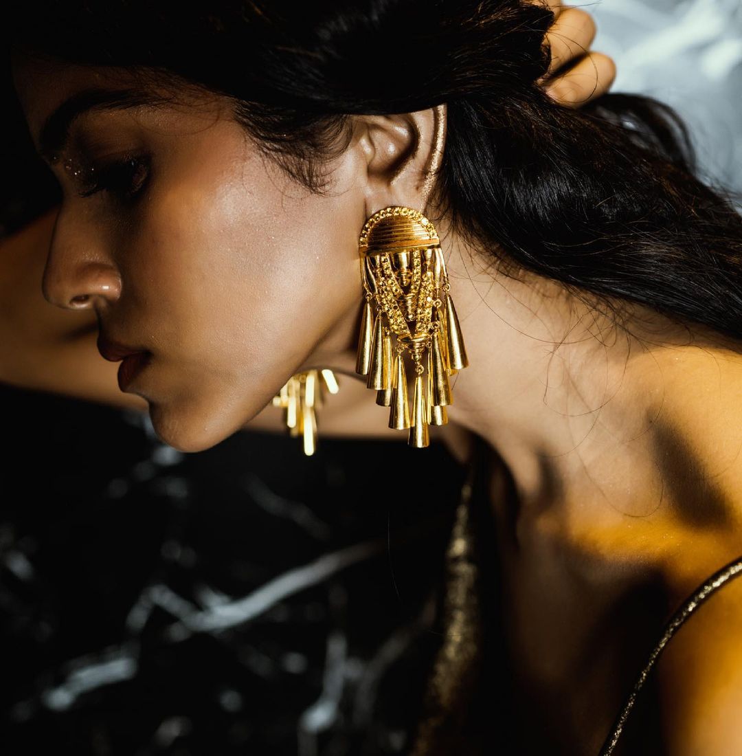 Like the sound of chiming bells, the tinkling sound of our Shikhara ear danglers lets people know you just blew into a room. These earrings are the killer trinity of architectural detail, accented bits of crystals, and delicate sheets of dangling gold.